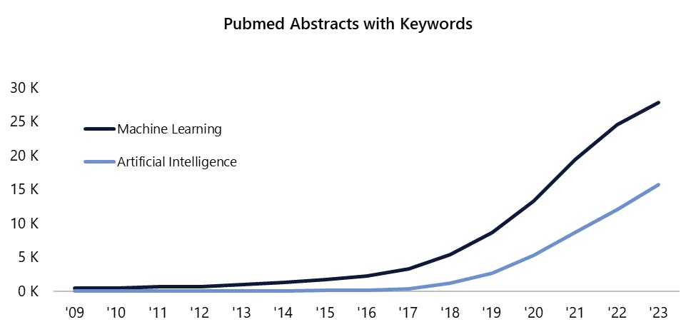 Figure 2: The number of Pubmed abstracts with the keywords “Machine Learning” or “Artificial Intelligence” has increased dramatically over the past 15 years.
