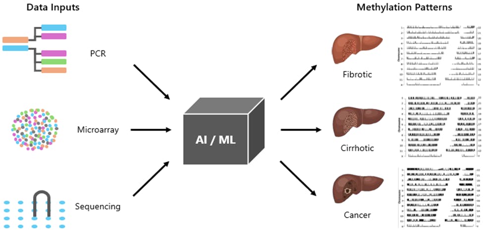 Our recent investment Curve Biosciences is a trailblazer in diagnostics focusing on developing cutting-edge early-stage liver diagnostics that will leverage AI. Curve’s data engine analyzes methylation patterns in cell-free circulating DNA in the blood. While it is understood that total methylation levels escalate over time, the exact tissue methylation patterns distinguishable in cell-free DNA that strongly relate with disease progression have remained elusive. Through the application of AI to analyze vast patient tissue DNA methylation datasets across various stages of chronic disease progression, Curve Biosciences has pinpointed predictive methylation signatures with subtle, previously undetectable patterns of methylation that strongly correlate with the stage of and progression of the disease (Figure 4). This innovative approach exemplifies the power of AI in transforming diagnostics and how we understand disease mechanisms with an immediate application in diagnostics.