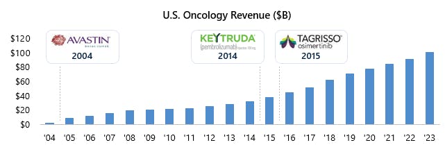 Figure 2: U.S. oncology sales have increased dramatically over the past 10 years with approvals of immunotherapies (e.g., Keytruda) and other targeted agents (e.g., Tagrisso) driving new sales volume.