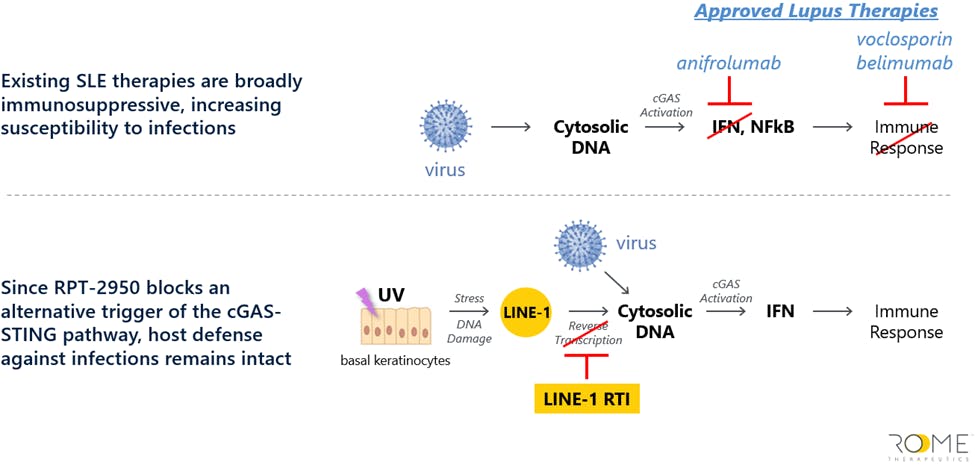Figure 6: Rome Therapeutics’ mechanism of action versus approved SLE treatments.