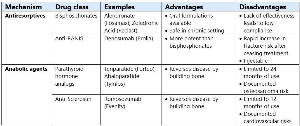 The American College of Physicians (ACP) currently recommends antiresorptives (bisphosphonates and Anti-RANKL therapies) as the initial drug treatment for postmenopausal women and men with primary osteoporosis. Bisphosphonates work by slowing osteoclast activity and reducing bone resorption, and they remain the most prescribed treatment for osteoporosis. If bisphosphonates do not work for patients, the second recommendation is anti-RANKL therapies (e.g. denosumab), while sequential treatment (bone building anabolic agents followed by a bisphosphonate) is reserved for women at very high fracture risk.[7] This sequencing is clinically sensible, but it also highlights a central limitation of the field: the therapies most practical for widespread long-term use are not always the most effective at rebuilding bone.
