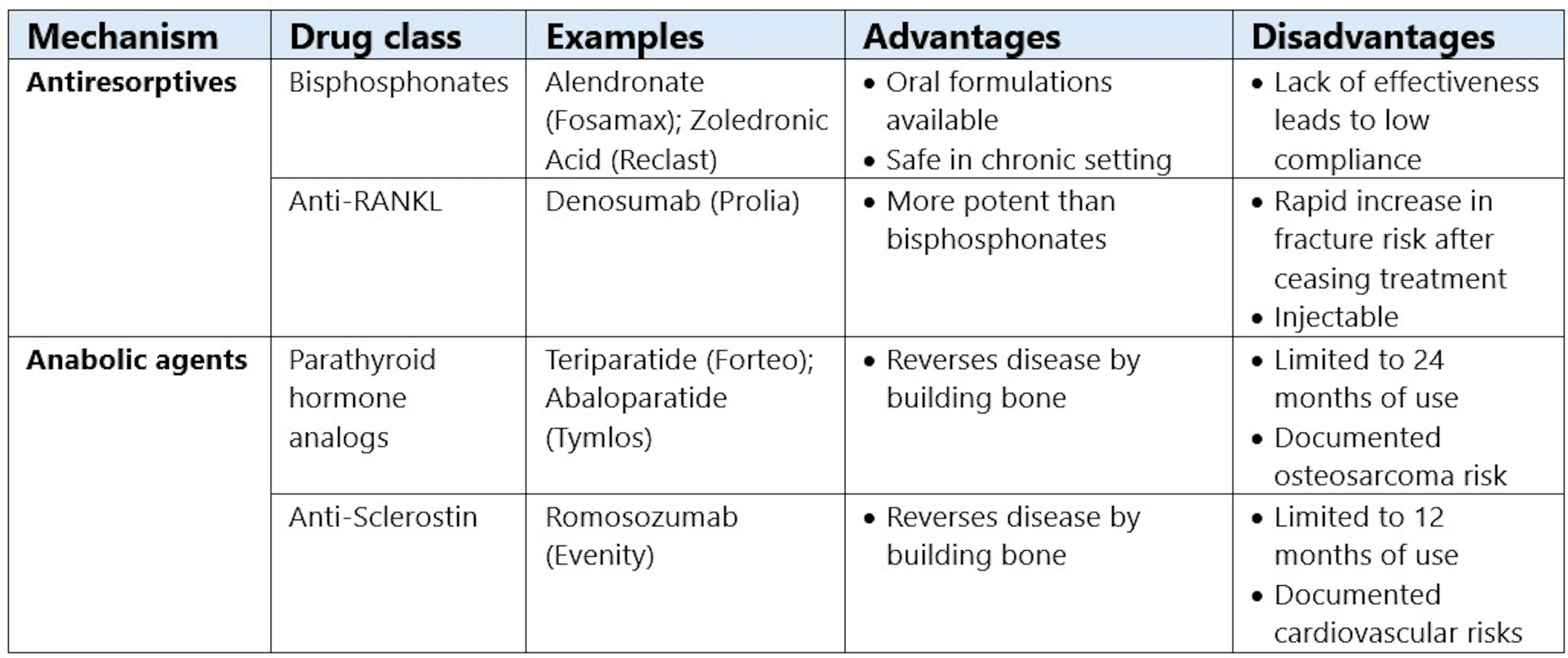 In contrast to antiresorptives, anabolic agents, such as the parathyroid hormone analogs and anti-sclerostin therapies, target the other half of the disease: inadequate bone formation. Anabolic therapy reduces fractures faster, and to a greater extent, than antiresorptive therapy in high- and very-high-risk patients, but their concerning side effects and safety risks limit them to short-term use rather than long-term treatment.