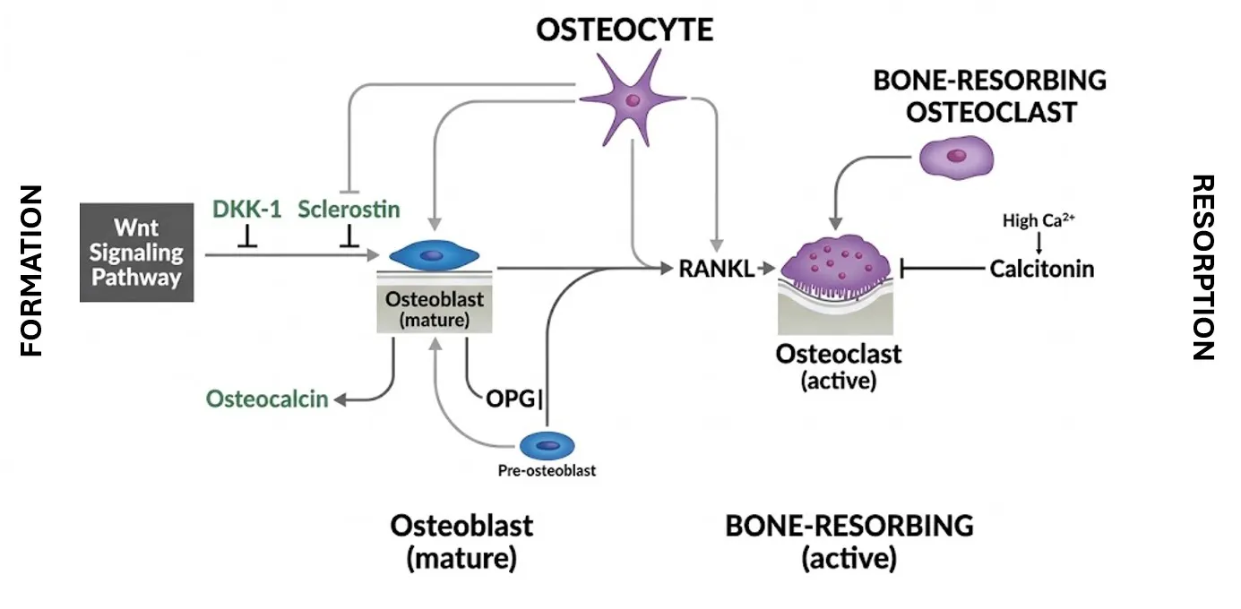 Bone density is one of the most integrated measurable outputs of remodeling biology and skeletal strength. Recent pooled analyses across randomized trials show that treatment-related increases in hip BMD are not just a correlation but confer a causal benefit; they correspond meaningfully with subsequent fracture reduction across multiple therapies.[6] For that reason, BMD has become a credible endpoint predictive of outcomes rather than just an exploratory biomarker. The main therapeutic strategies for osteoporosis focus on the two key components of the disease: excessive bone resorption and inadequate bone formation.