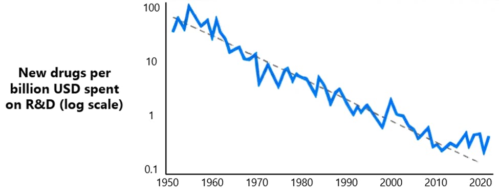 Figure 2: Eroom’s Law depicted by illustrative historical regression of significant increase of drug discovery and development.