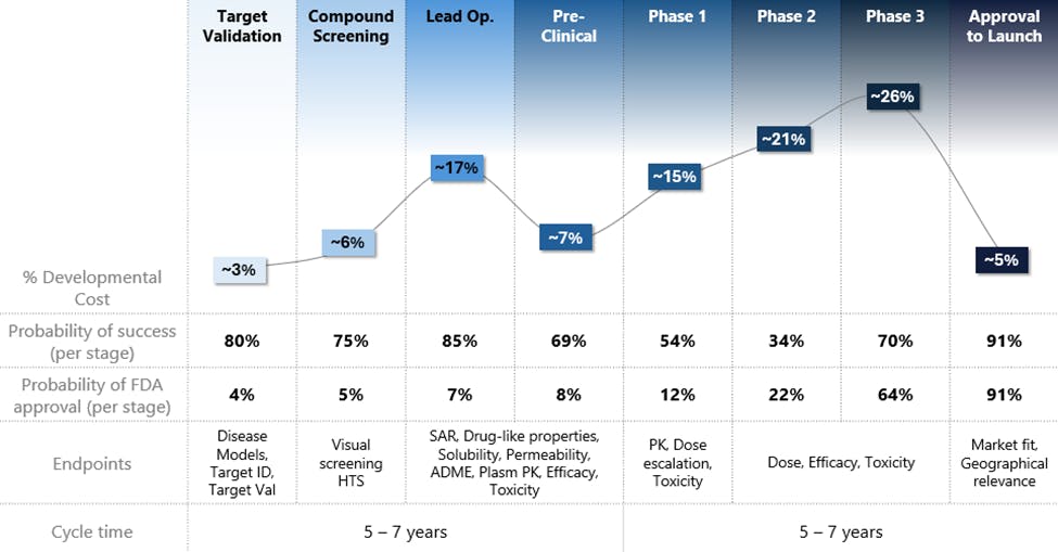 Figure 1: Overview of critical endpoints, cost, and risk profile of each discovery and development stages.