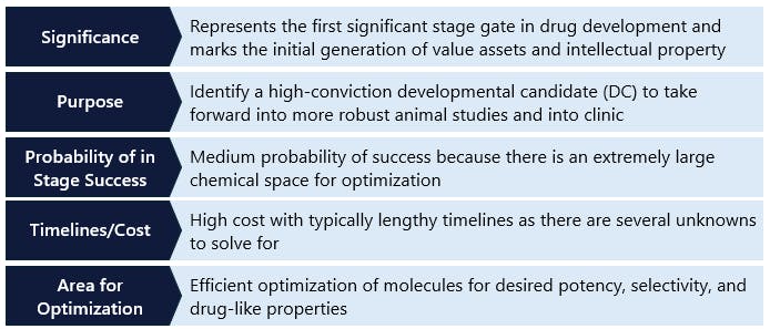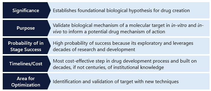 In this document, we break down the drug discovery process into distinct steps and summarize each with a table that reviews key aspects. These aspects include the step’s “significance,” which refers to its importance in the overall process of creating a drug; its “purpose,” highlighting the key data generation objectives; its “probability of in-stage success (PoS),” indicating the likelihood that a drug candidate will successfully advance to the next stage; its “timelines/costs,” which detail the expected duration and associated expenses; and its “areas for optimization,” where we identify opportunities for companies to enhance their risk-adjusted outcomes in drug discovery.