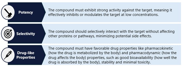 The next critical phase is lead discovery and optimization after identifying potential hits in the drug discovery process. This stage focuses on picking one or more candidate compounds and then refining and improving those compounds to meet specific criteria, ensuring they possess the necessary properties to become effective drugs. Lead compounds are characterized by their potency, selectivity, and overall drug-like properties (see “Criteria for Lead Compounds,” below). This critical step can be one of the longer steps in the process, as development teams make minor modifications to the compound or compounds and repeatedly test those changes to develop stronger candidates for further development (figure 4). It would not be unusual for a team to test hundreds – or even thousands – of potential modifications before settling on a lead candidate.