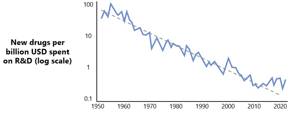 Figure 6: Eroom’s Law depicted by illustrative historical regression of significant increase of drug discovery and development.