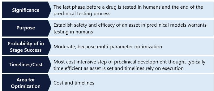 After the lead optimization phase, promising drug candidates enter preclinical development. This critical stage involves extensive testing to evaluate the drug candidate’s safety, efficacy, and pharmacokinetic properties before it progresses to clinical trials. IND-enabling work includes both in vitro and in vivo studies, providing a comprehensive understanding of the drug’s potential effects on biological systems. Though many of the approaches are similar to those used in lead optimization, they are typically much larger and longer studies done in cells and animals to understand the behavior of the drug holistically. These studies form the foundation for a data package submission to the FDA. FDA approval is required before a candidate can begin human testing in the US. Other countries have similar standards (Figure 5).