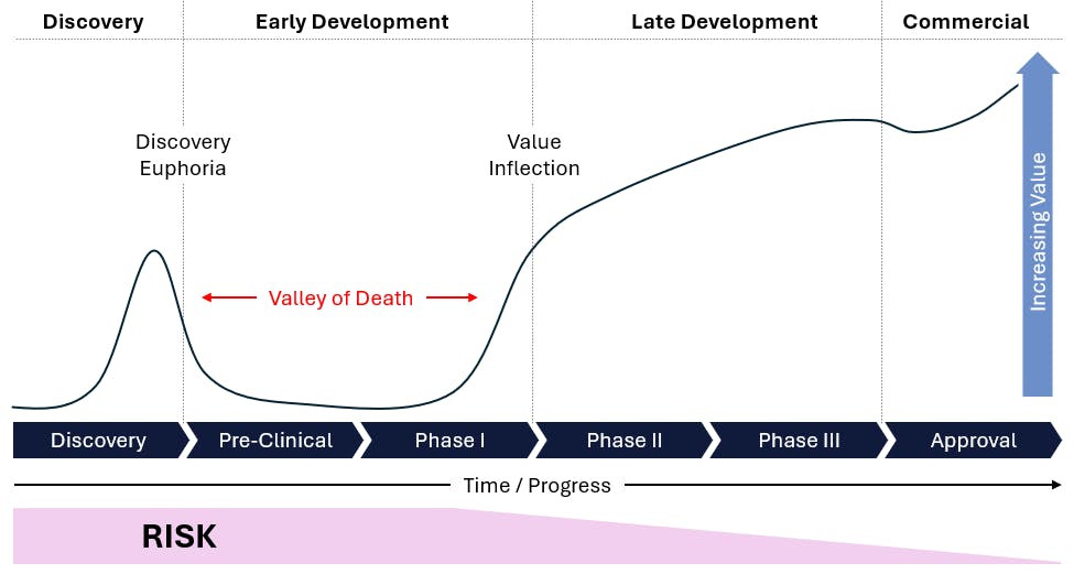 Valley of Death: Significant requirements for capital and time asymmetries exist between value generation and risk reduction in drug development. Combined with the high costs and binary nature of outcomes, this necessitates that companies raise or spend substantial capital to mitigate risks during the development process. These gaps contribute to the “valley of death,” a critical phase where companies may lack the necessary funds to navigate lengthy and expensive stages of development, potentially forcing them to halt their programs (Figure 7). For instance, the biotech company Epizyme faced considerable financial challenges in advancing its cancer drug, Tazemetostat, through clinical trials but overcame these issues to be approved and is now commercially available. Despite promising early results, the high costs and extended timelines required significant capital, leading to delays and funding gaps that exemplify the difficulties of the “valley of death” in drug development.